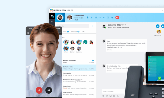 Includes team chat, HD video conferencing (100 web participants), screen sharing, file sharing (50GB), and extension dialing accessible through Elevate desktop and mobile apps. Does not include E911 and external calling.